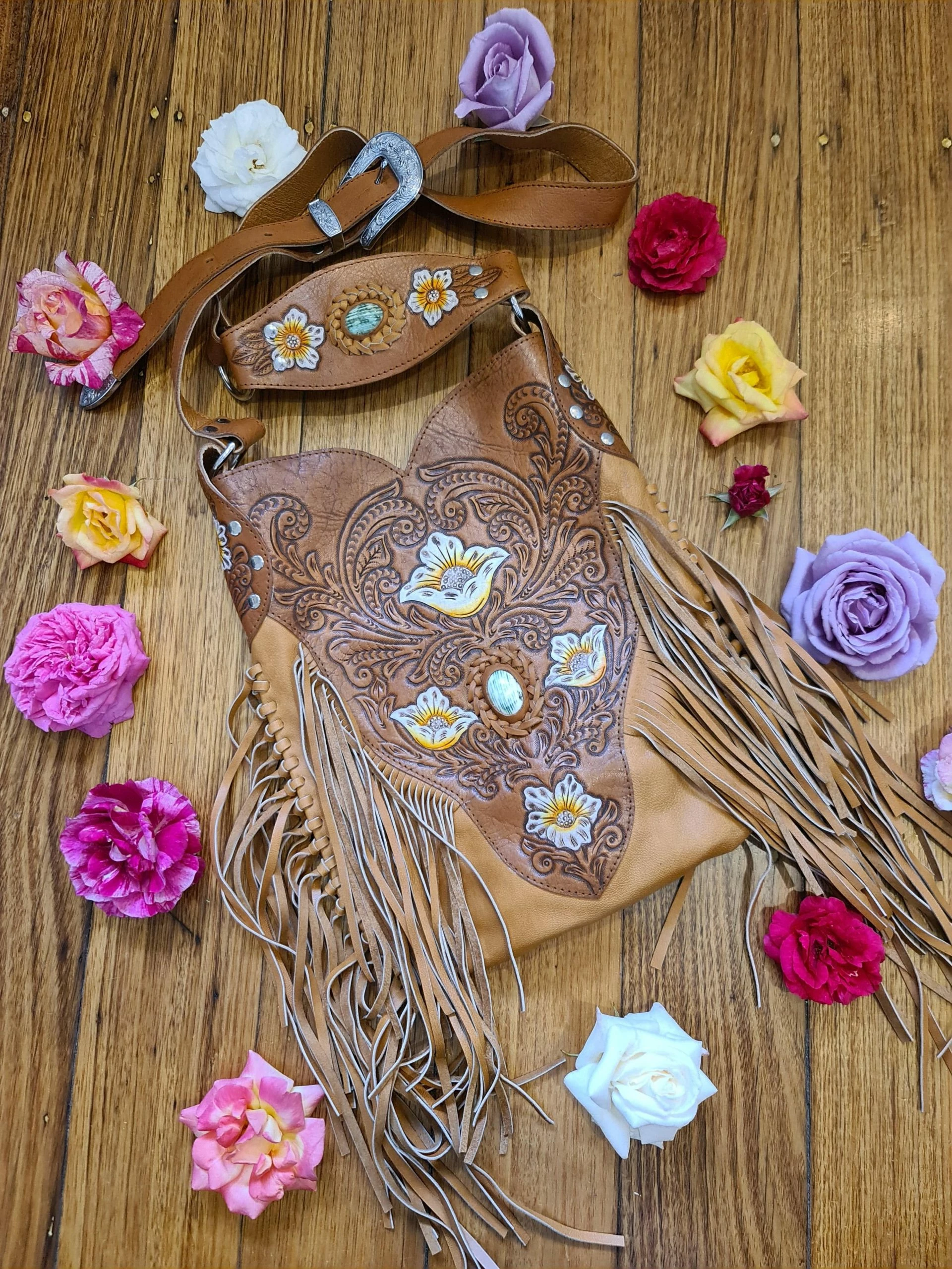 Look no further than Celestial Gypsy The Label for the best styles for boho bags. Celestial Gypsy has a wide selection of boho handbags & boho wallets that suits the lifestyles of every sort of girl. The Arielle Fringe leather bag in Tan features hand tooled and hand painted floral design with a shell inlay.
