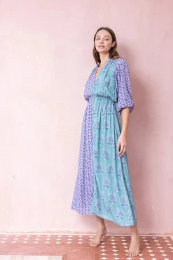 This soft lilac dress, adorned with a mesmerizing blue and deep purple floral print, captures the essence of a dreamy garden in full bloom. The button-through front reveals thoughtful attention to detail, while the shoulder yoke adorned with pintucks and ladder lace details adds a touch of delicate intricacy that sets this dress apart.