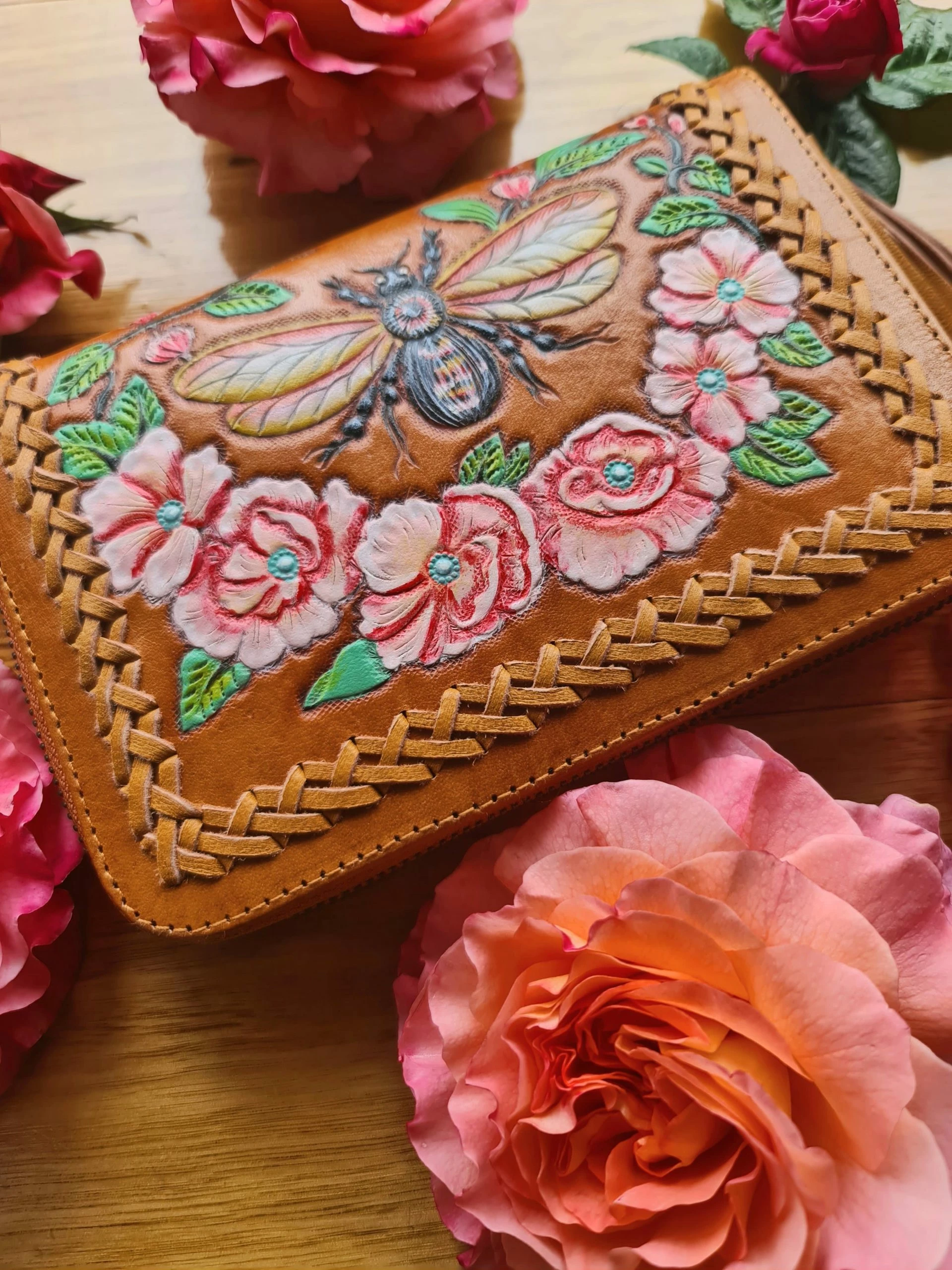 Introducing the Bumble Bee Wallet in the elegant Tan colour. This exquisite leather wallet is a testament to the beauty of hand-painted and hand-tooled craftsmanship. Designed with the modern woman in mind, it combines functionality, sophistication, and a touch of bohemian charm.