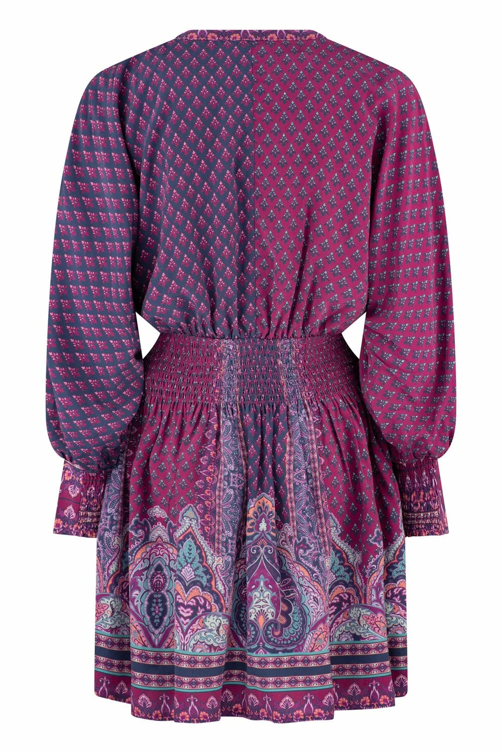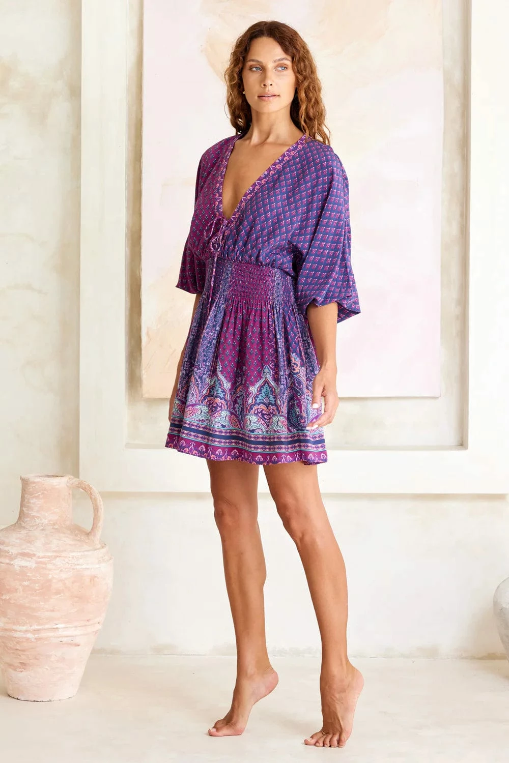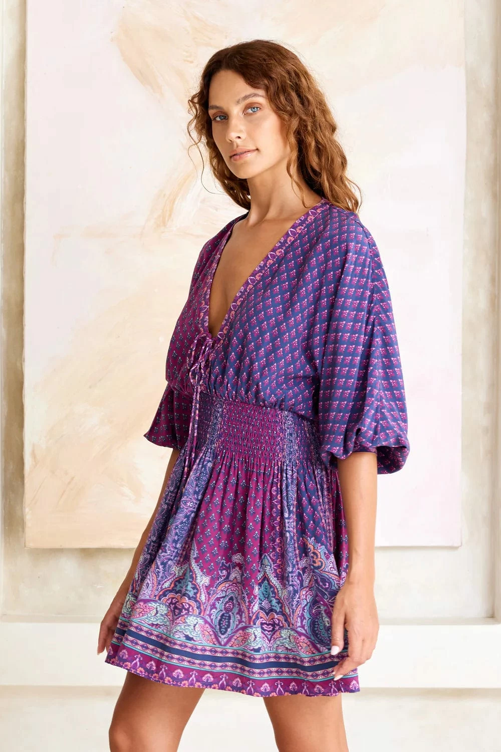 – Mini length dress – Deep V front neckline with lace up detail – Deep shirred waistband – Patchwork print – Blouson sleeves with shirred cuff – In our luxurious viscose fabrication