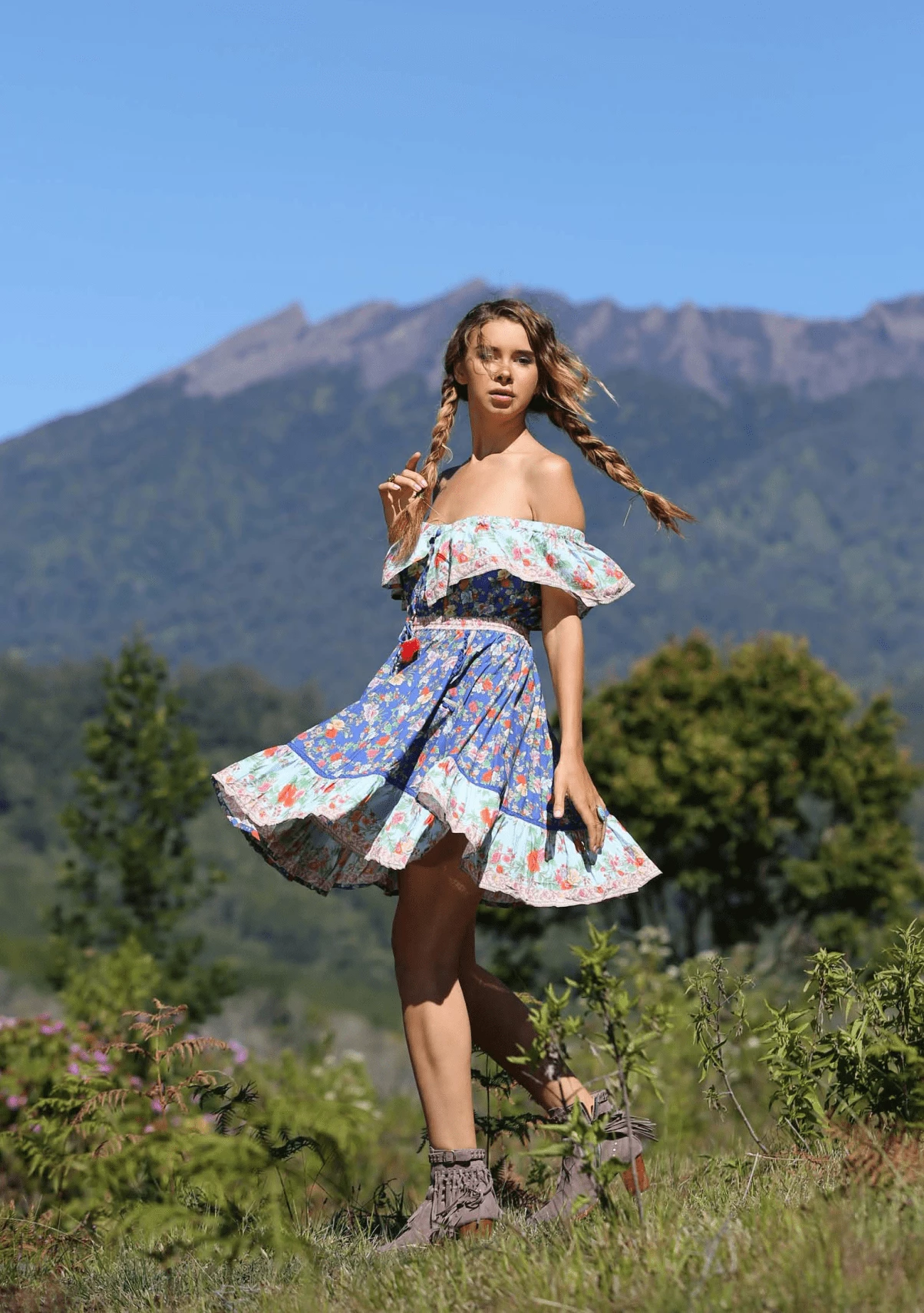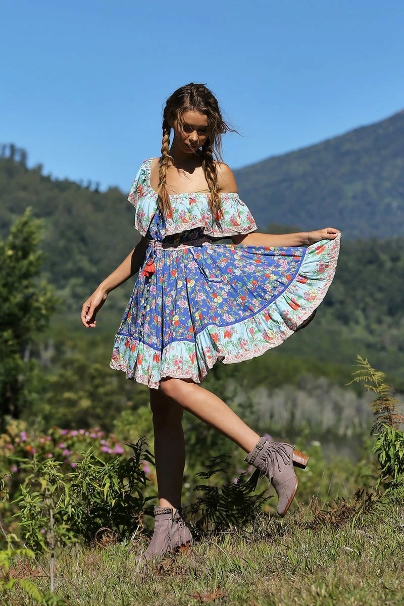 The ultimate in pretty style for our bohemian babes, the Hosannah Mini Dress is the perfect new addition to your summer wardrobe. Featuring a beautiful off-shoulder neckline that fits so comfortably you will be ready to dance the night away at your next festival! The elastic is beautifully soft, allowing it to be worn on or off the shoulder with ease. The ultimate in feminine vintage style, this mini is adorably cute and flirty. A comfortable elastic waist and gorgeous pockets add style and effortless charm to this lovely piece. Just add your favourite boots or flats and you will be ready for cocktails at the beach, festivals and fun. Be prepared to get noticed! Featuring our stunning Lost in Paradise print with vibrant flowers, this gorgeous dress is available in three colour ways, Rococo Red, Lapis Lazuli and Lotus.