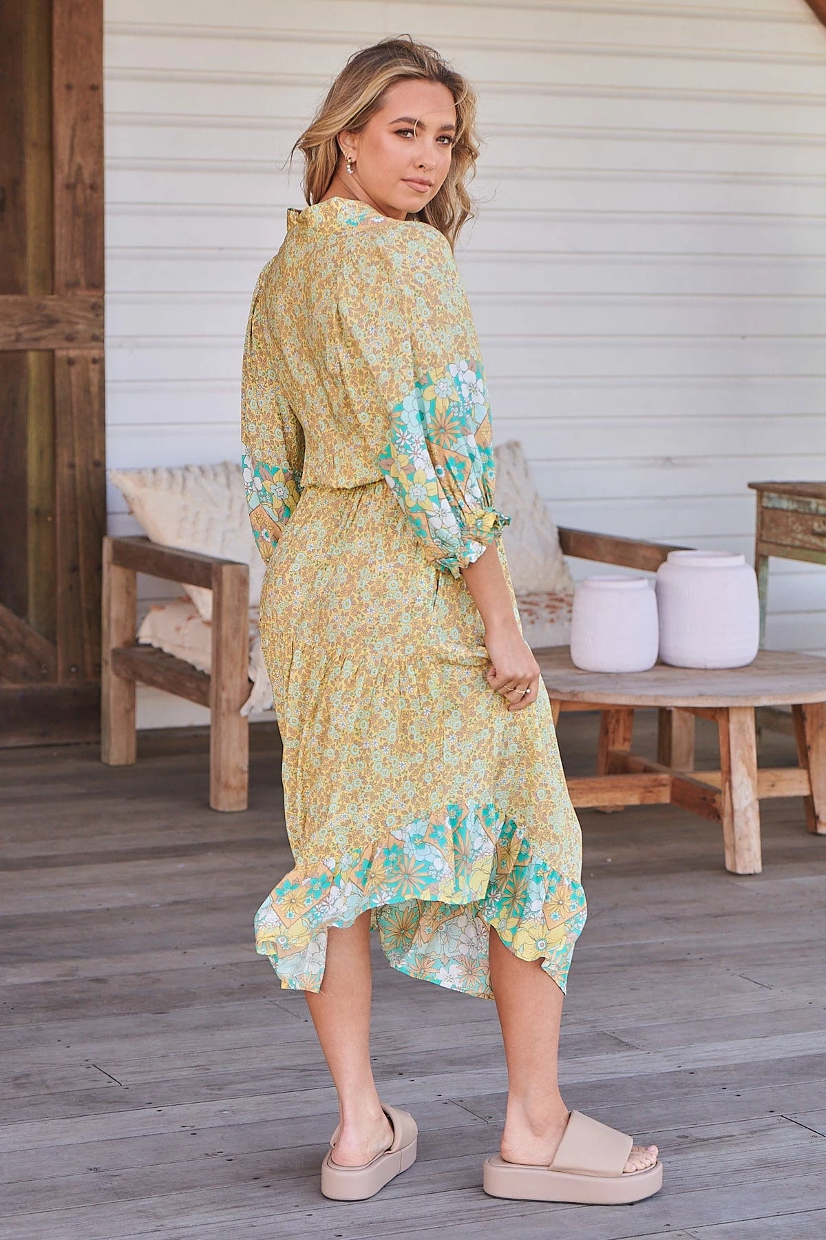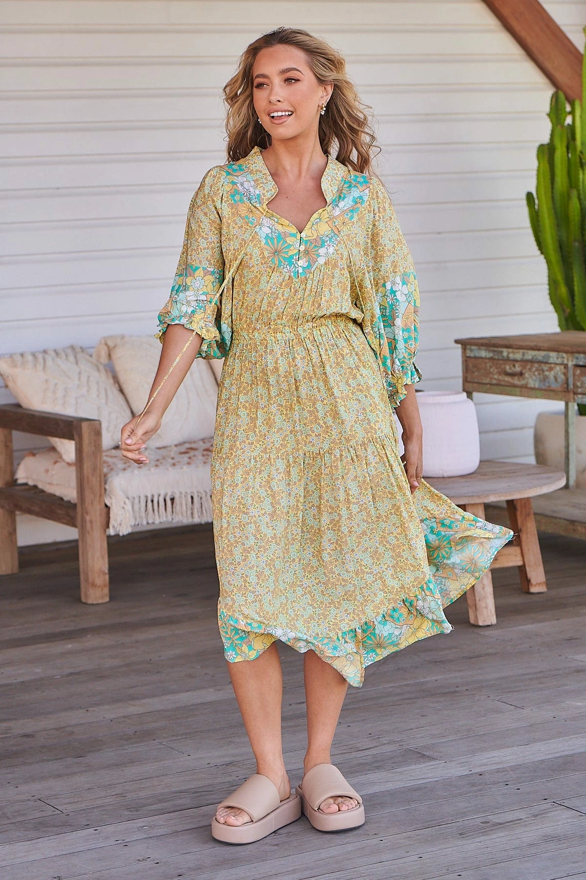 The ‘Jasmine Midi Dress’ in ‘Pompeii Citrus’ by Jaase clothing is the perfect boho midi dress for everyday wear or can be dressed up for your next occasion! It features a Citrus tone with multi bright tones and a floral print, 3/4 sleeves with elastic cuffs, pocket and a floaty style skirt.Â
