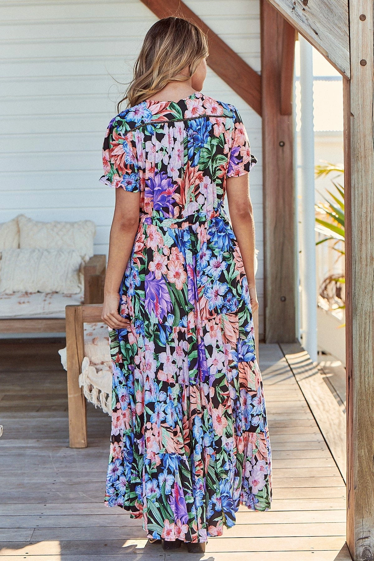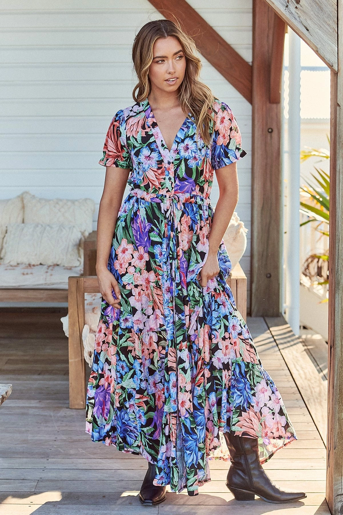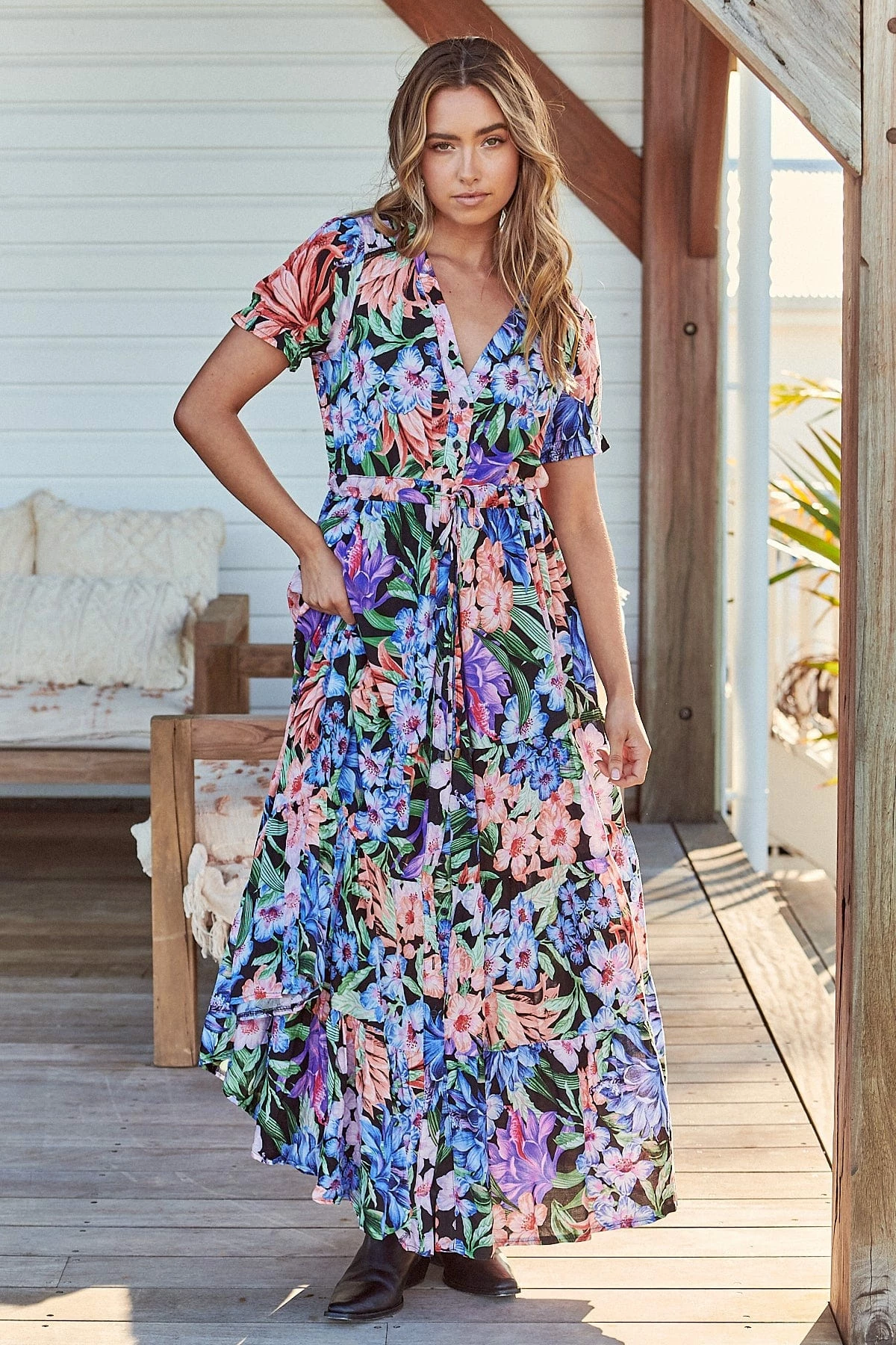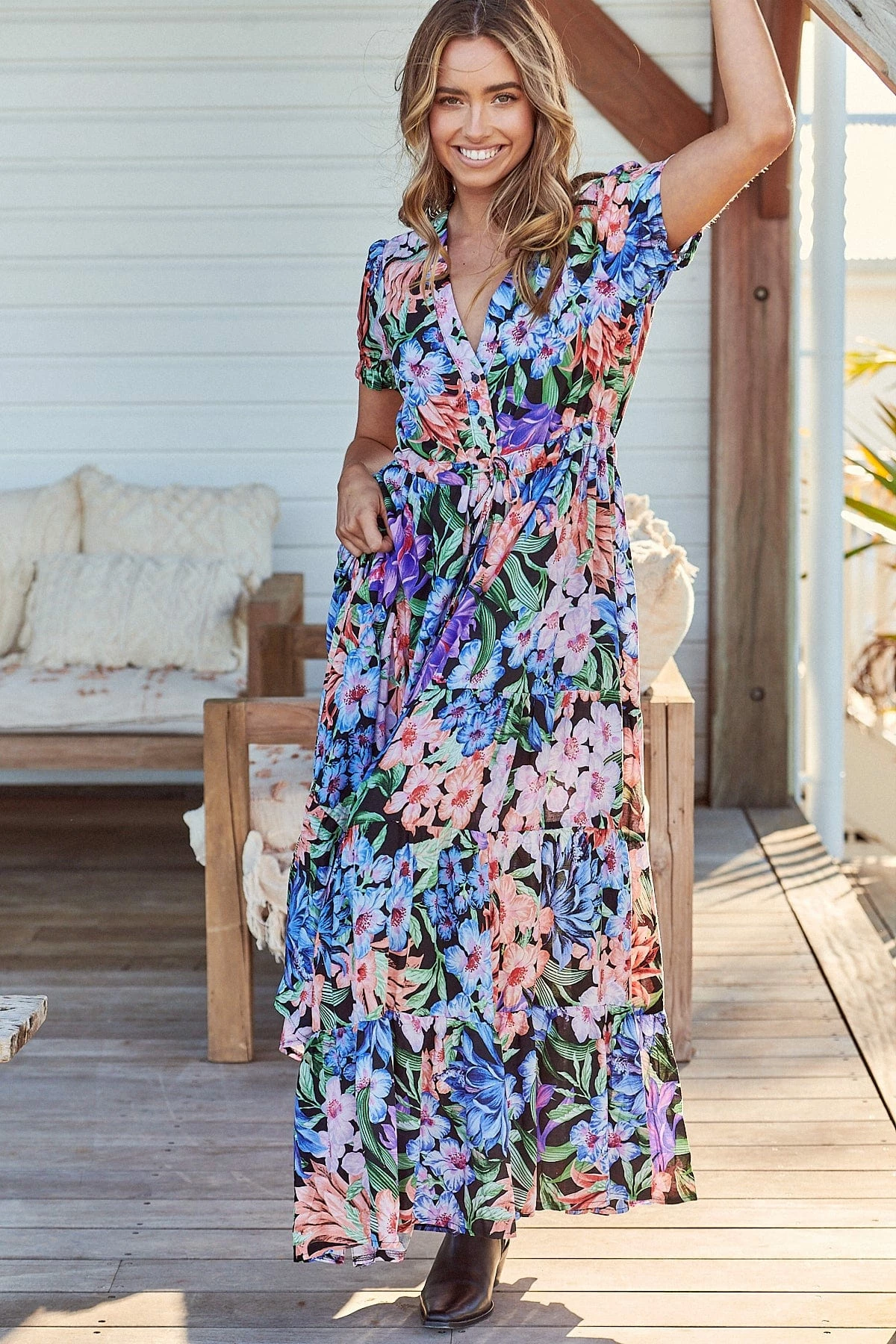 Our stunning new ‘June Maxi Dress’ in ‘Midnight Tropics’ print by Jaase clothing, is that colourful Spring ready maxi to add to your collection! It features a V neckline, buttoned bodice and short sleeves with elastic cuff.Â