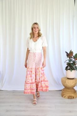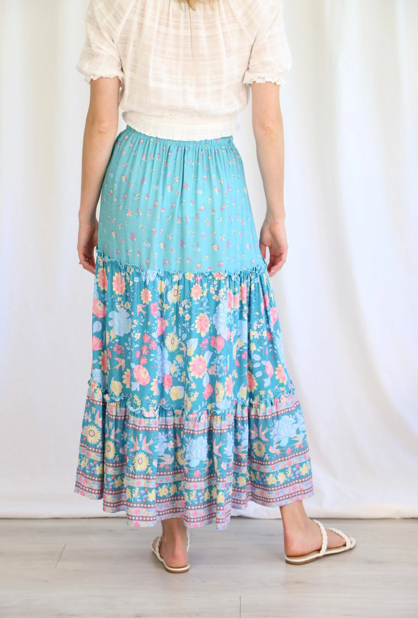 The ‘Miley Maxi Skirt’ in ‘Fairyfloss floral’ by Salty Bright is a stunning teal and mint boho maxi skirt, and is perfect to team back with a boho graphic tee. Featuring a elasticated waist band for an easy fit. A line skirt style in 100% Rayon perfect for the new warm season and a beautiful soft fabric feel.