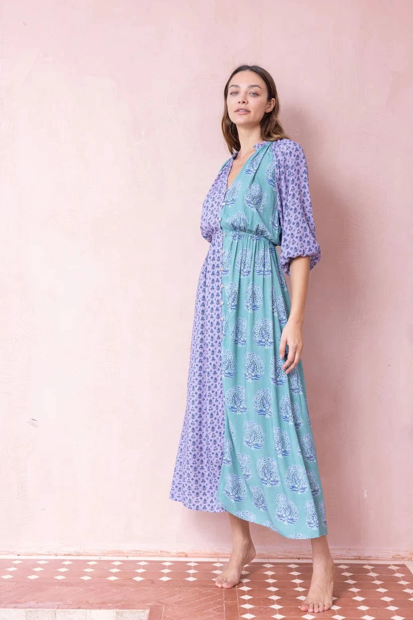 A stunning button down bohemian maxi dress, with two-tone colour detail. Featuring a delicate ruffle edge collar and a raglan half sleeves, as well as iconic gold Tigerlily button detail.Â