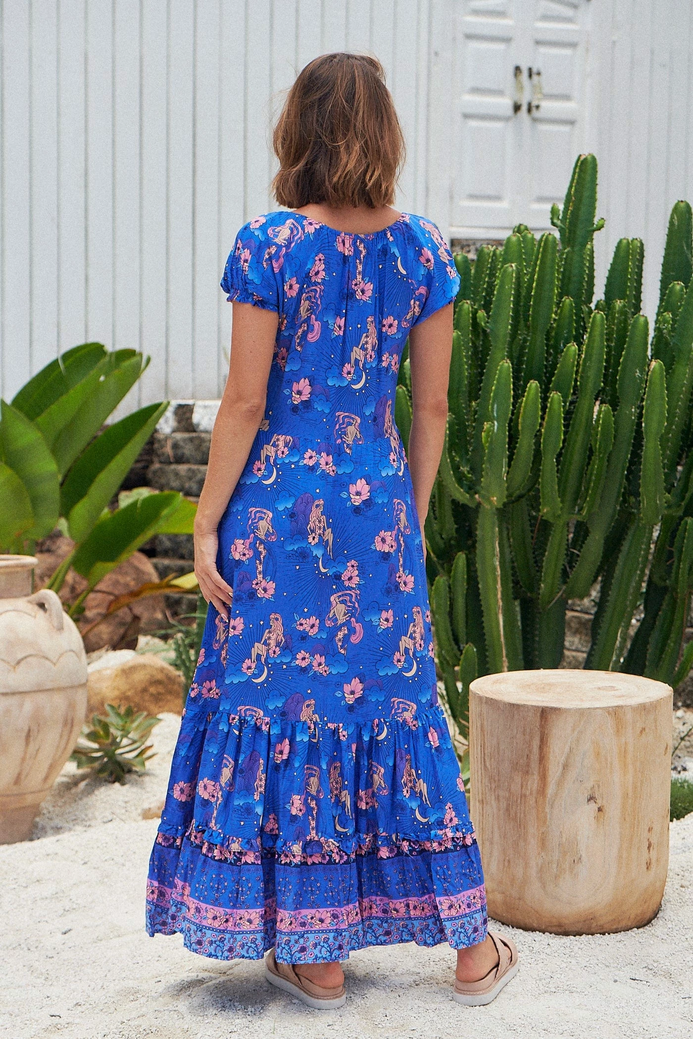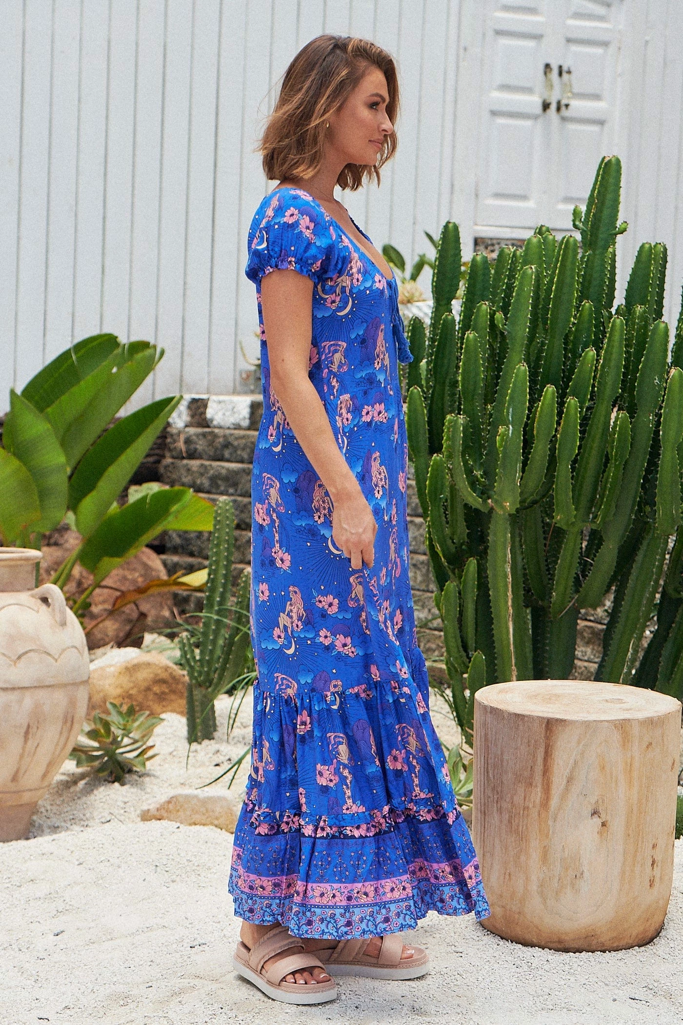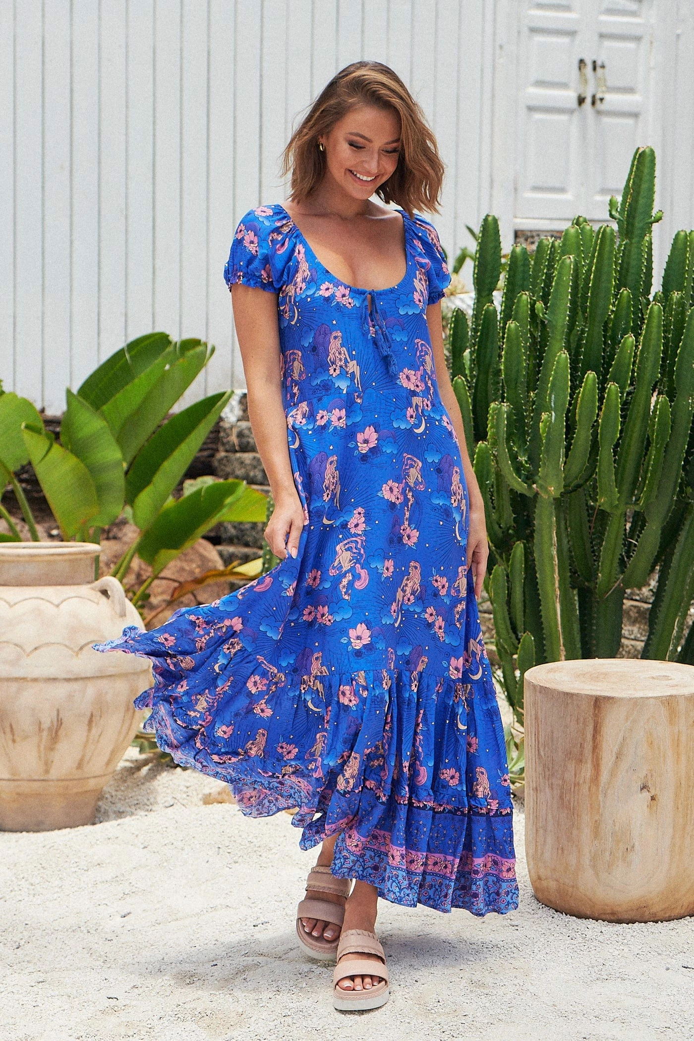 We are obsessed with our Saria Maxi Dress in Soleil, perfect for the new season in this stunning blue tone. Featuring a round neckline, capped sleeve with elastic frill that can be worn on or off the shoulder.Â