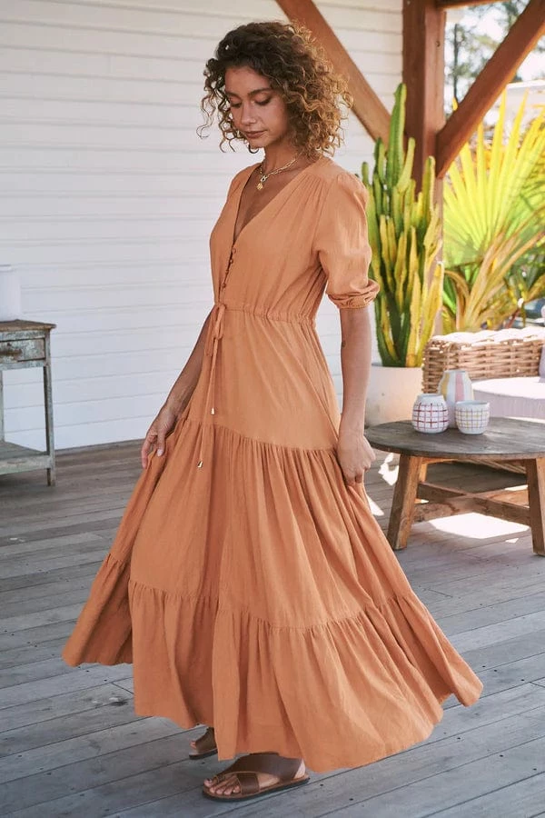 Adorned in a honey-coloured golden hue, this dress adds a touch of warmth and radiance to your ensemble. The Tessa Maxi Dress speaks of sun-kissed afternoons and carefree moments, making it an ideal choice for a variety of settings.